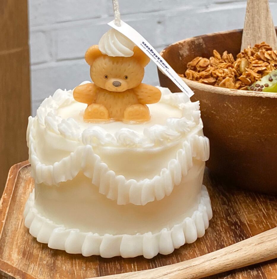 生クリームの帽子を被り、ビンテージな雰囲気のケーキの上に
